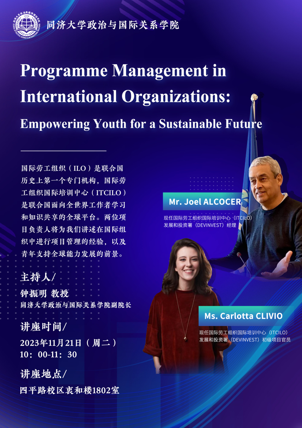 2023年11月21日,国际劳工组织国际培训中心主任乔尔·阿尔科萨先生(Joel ALCOCER)和初级项目官员李思璇女士(Carlotta CLIVIO)应邀访问同济大学半岛online(中国)并同我院部分师生展开交流。学院副院长钟振明教授主持了交流会,我院部分教师和本硕博学生参加交流。