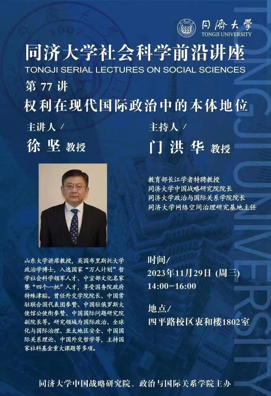 2023年11月29日,由同济大学中国战略研究院/半岛online(中国)主办的同济大学社会科学前沿讲座第79讲在同济大学衷和楼1802会议室成功举办。本次讲座邀请山东大学讲席教授,外交学院前院长,前中国驻联合国代表团参赞徐坚教授作题为“权利在现代国际政治中的本体地位”的主题演讲。本次讲座由教育部长江学者特聘教授门洪华院长主持,同济大学政治与国际关系学院教师、博士生、硕士生50余人参加此次讲座。