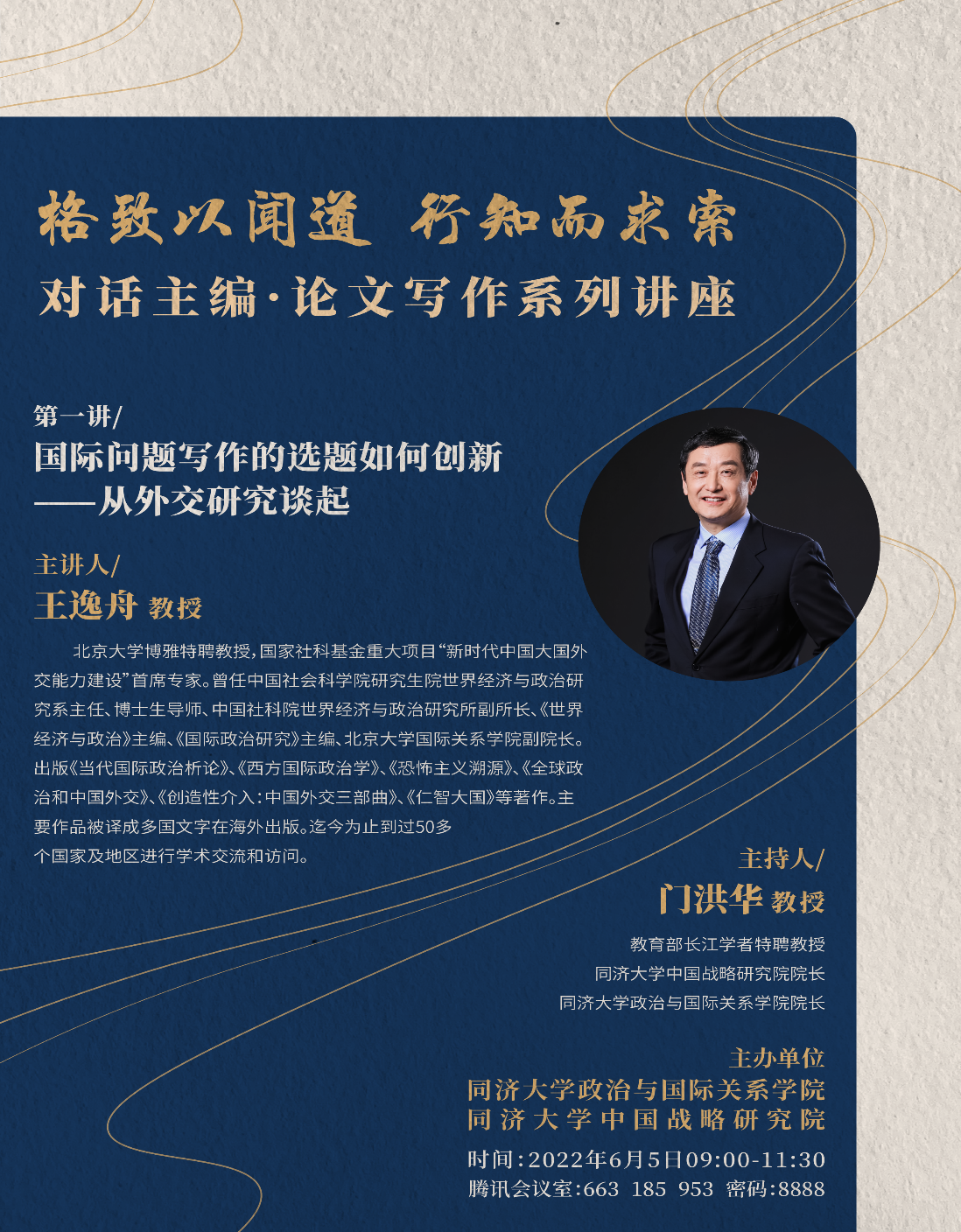 2022年6月5日上午,由同济大学半岛online(中国)/中国战略研究院主办的“格致以闻道 行知而求索”对话主编·论文写作系列讲座第一讲成功举办。本次讲座邀请到北京大学博雅特聘教授、《国际政治研究》主编王逸舟教授作题为“国际问题写作的选题如何创新——从外交研究谈起”的主题演讲。本次讲座由教育部长江学者特聘教授、同济大学中国战略研究院/半岛online(中国)院长门洪华教授主持,来自国内外78个高校的700余名师生参加了此次线上学术讲座。