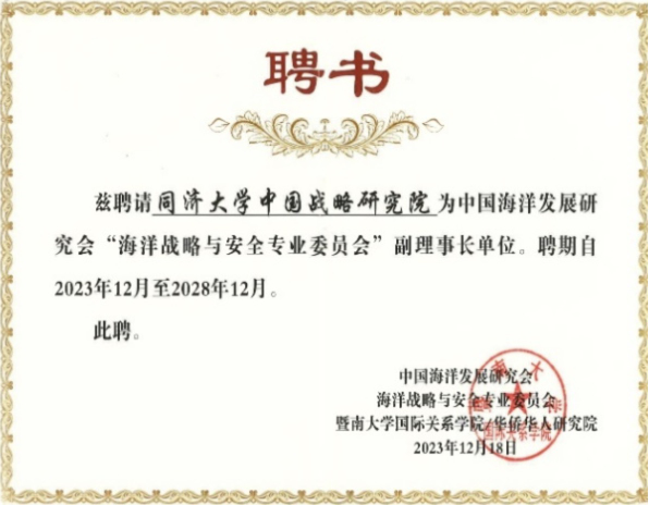 在12月20日召开的中国海洋发展研究会海洋战略与安全专业委员会换届大会上,同济大学中国战略研究院当选中国海洋发展研究会海洋战略与安全专业委员会副理事长单位,门洪华教授当选中国海洋发展研究会海洋战略与安全专业委员会副理事长和学术委员会副主任委员,钟振明教授当选常务理事兼副秘书长,宋国新博士后当选理事。