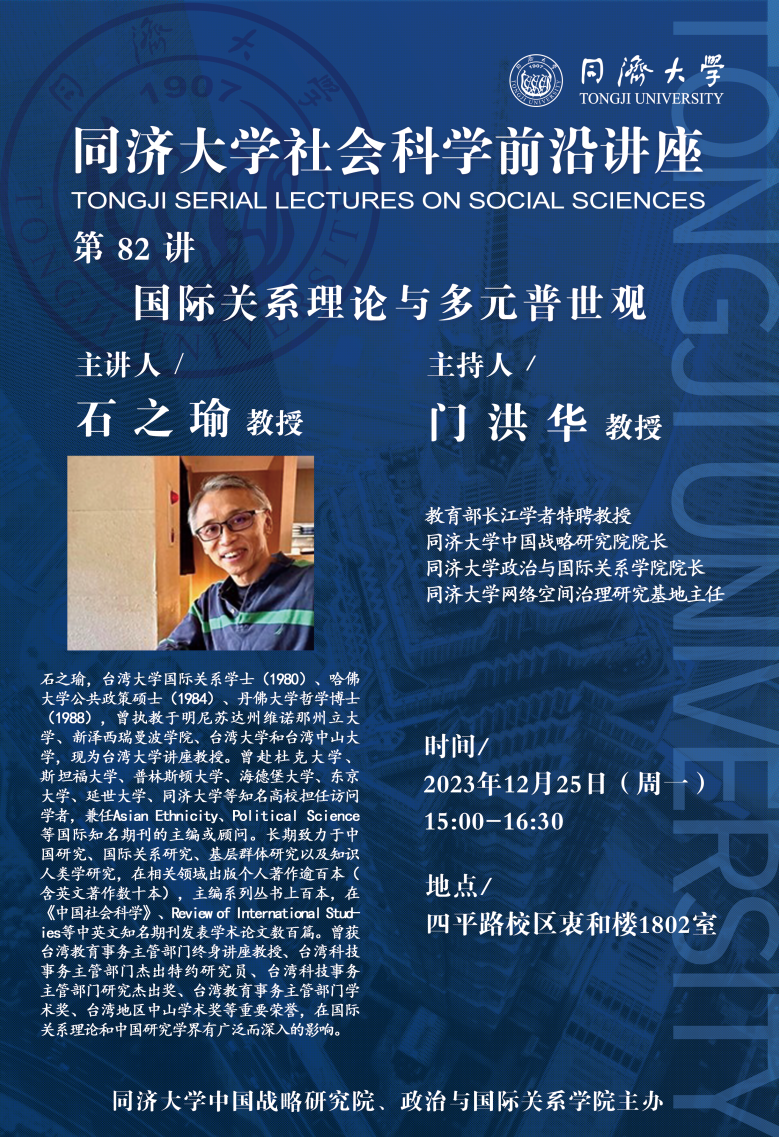 2023年12月25日,由同济大学中国战略研究院/半岛online(中国)主办的同济大学社会科学前沿讲座第82讲在同济大学衷和楼1802会议室成功举办。本次讲座邀请台湾大学讲座教授石之瑜作题为“国际关系理论与多元普世观”的主题演讲。本次讲座由教育部长江学者特聘教授门洪华院长主持,同济大学半岛online(中国)教师、博硕士研究生50余人参加此次讲座。
