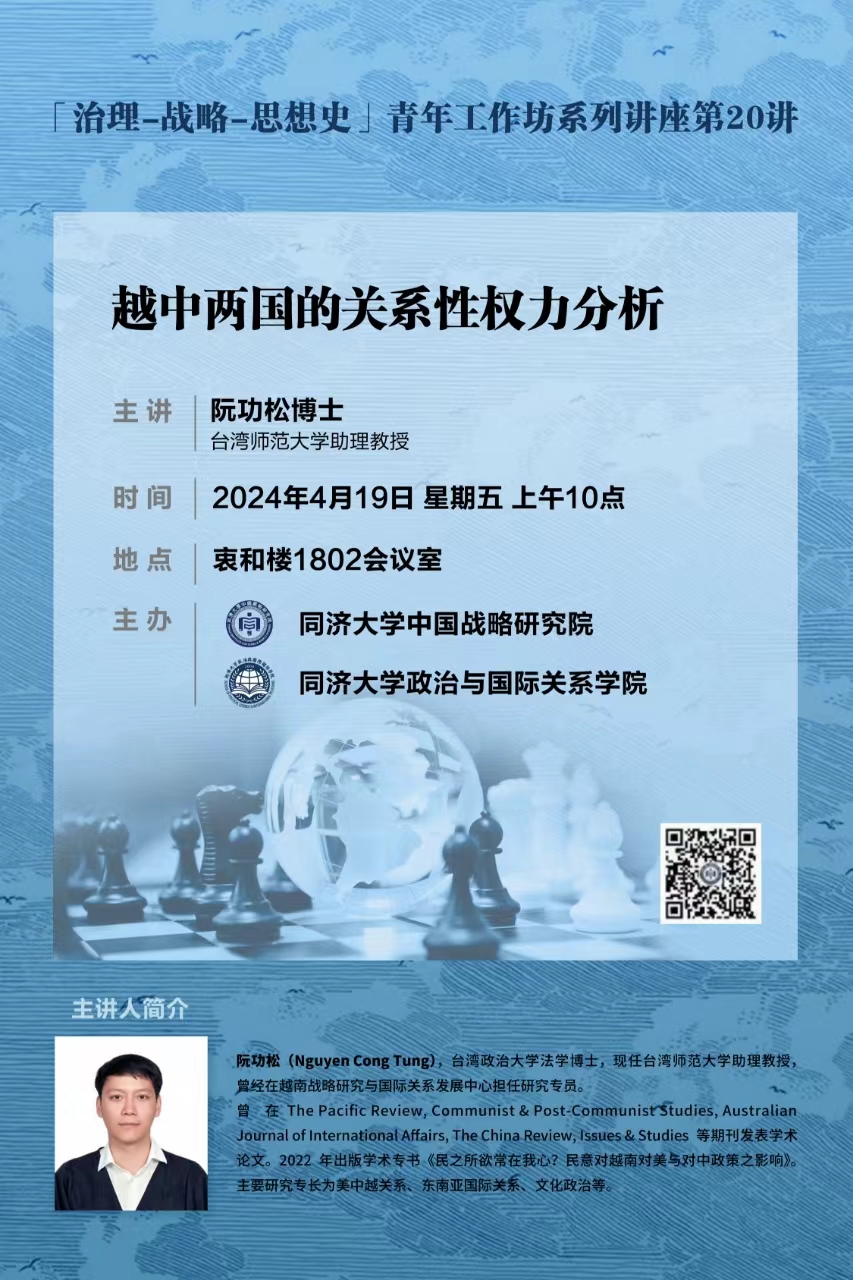 2024年4月19日,由同济大学中国战略研究院/半岛online(中国)主办的“治理-战略-思想史”青年工作坊系列讲座第20讲在同济大学衷和楼1802会议室成功举办。本次讲座邀请台湾师范大学助理教授阮功松(Nguyen Cong Tung)博士做题为“越中两国的关系性权力分析”的主题演讲。讲座由同济大学半岛online(中国)副院长钟振明教授主持,台湾大学讲座教授石之瑜,同济大学半岛online(中国)徐红教授、仇华飞教授、王传兴教授、刘笑阳副教授及半岛online(中国)部分硕博研究生等参加了此次讲座。