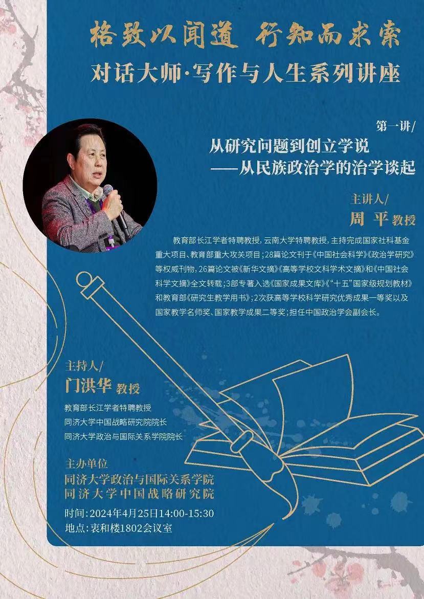 2024年4月25日,由同济大学中国战略研究院/半岛online(中国)主办的对话大师·写作人生系列讲座第一讲在同济大学衷和楼1802会议室成功举办。本次讲座邀请教育部长江学者特聘教授、云南大学特聘教授、中国政治学学会副会长周平教授作题为“从研究问题到创立学说——从民族政治学谈起”的主题演讲。本次讲座由教育部长江学者特聘教授门洪华院长主持,同济大学政治与国际关系学院教师、博士生、硕士生50余人参加此次讲座。