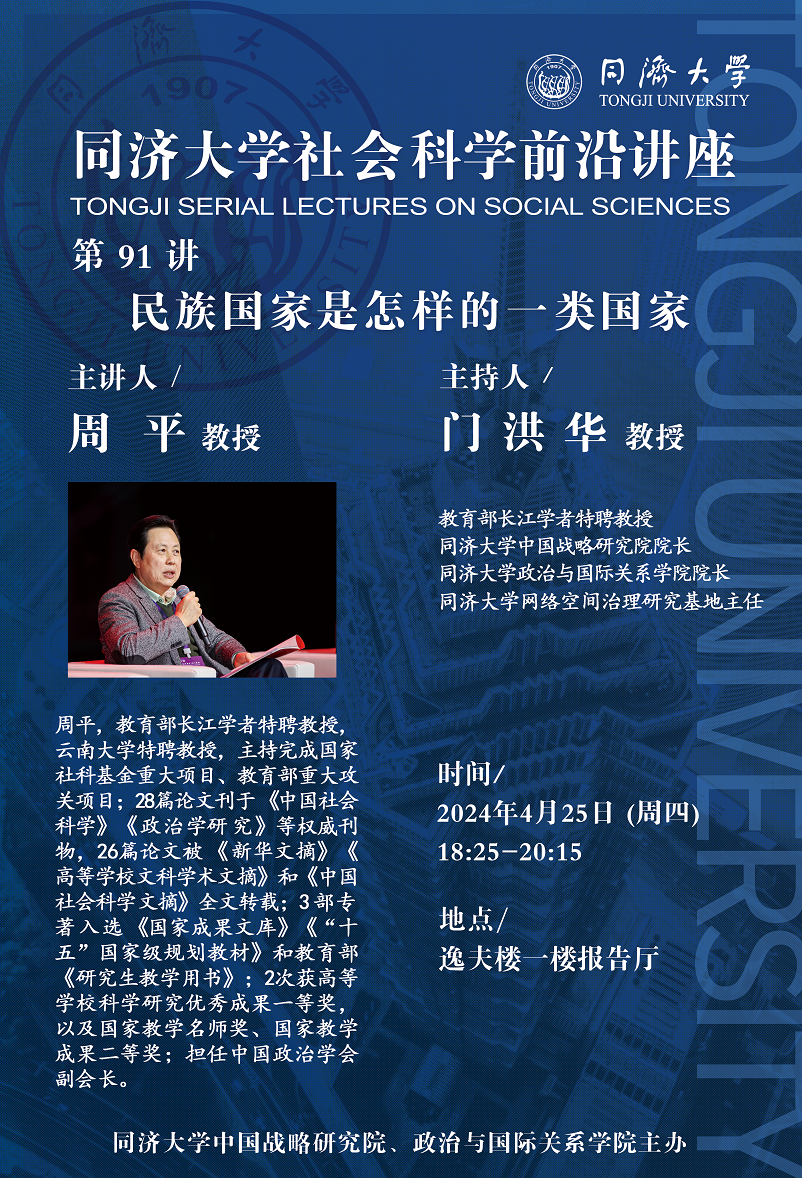 2024年4月25日,由同济大学中国战略研究院/半岛online(中国)主办的同济大学2024年度校级高等讲堂第80讲、同济大学社会科学前沿讲座第91讲在同济大学逸夫楼一楼报告厅成功举办。本次讲座邀请教育部长江学者特聘教授、中国政治学学会副会长、云南大学特聘教授周平先生作题为“民族国家是怎样的一类国家”的主题演讲。本次讲座由教育部长江学者特聘教授门洪华院长主持,同济大学教师、博士生、硕士生300余人参加了此次讲座。