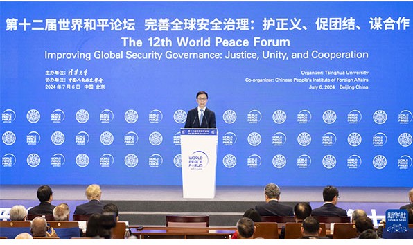 由清华大学主办和中国人民外交学会协办、以“完善全球安全治理:护正义、促团结、谋合作”为主题的第十二届世界和平论坛2024年7月6-7日在清华大学和辽宁大厦举行。国家副主席韩正出席论坛开幕式并致辞,日本前首相鸠山由纪夫、法国前总理德维尔潘等外国前政要,教育部副部长陈杰、外交部部长助理赵志远、中共中央党校原副校长李君如、中共中央对外联络部原副部长艾平,清华大学党委书记邱勇和校长李路明,来自80余国的驻华使节、专家学者等400余人出席论坛,重点讨论如何在逆全球化的大环境下,各国通过达成共识促进新的合作,并为未来建设稳定的国际秩序作出努力,以维护世界和平。