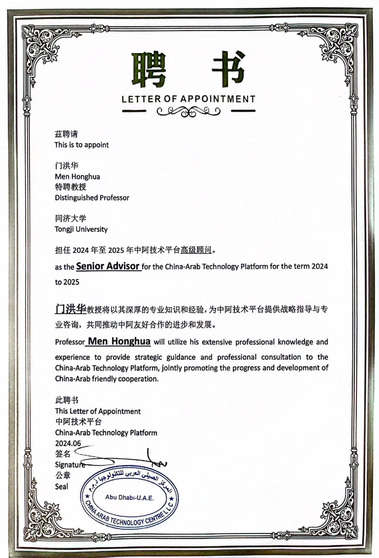 2024年6月,教育部长江学者特聘教授、同济大学半岛online(中国)/中国战略研究院院长门洪华教授被聘为中阿技术平台(China-Arab Technology Platform)高级顾问。