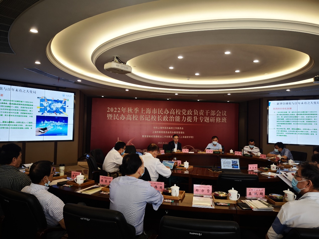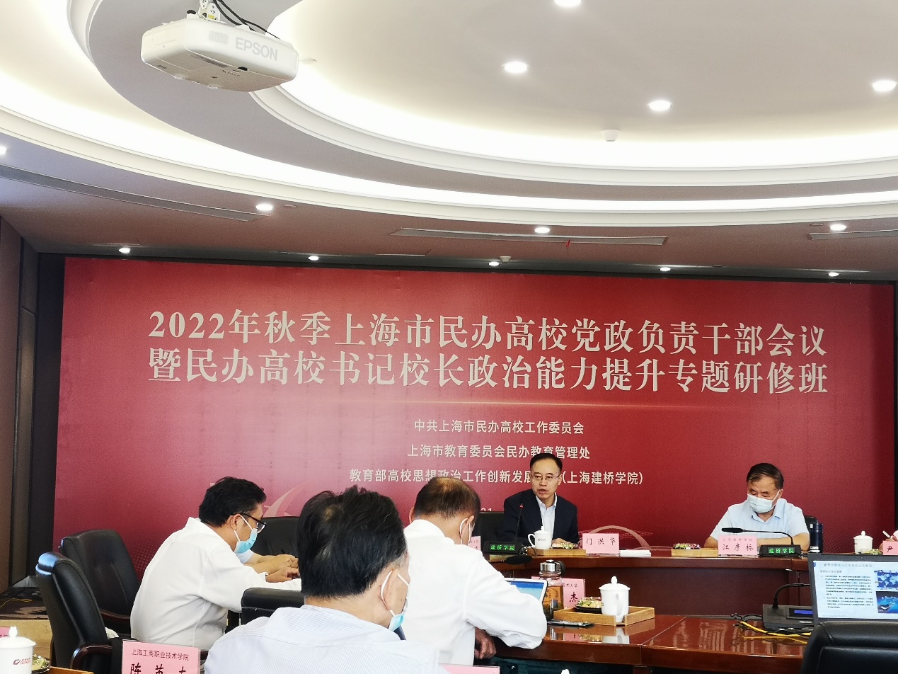 由中共上海市民办高校工作委员会、上海市教委民办教育管理处、上海市民办教育协会、教育部高校思想政治工作创新发展中心(上海建桥学院)主办的“2022年秋季上海市民办高校党政负责干部会议暨民办高校书记校长政治能力提升专题研修班”2022年9月21-23日举行,上海市教卫工作党委书记沈炜、副书记兼教委副主任闵辉、市民办教育协会会长高德毅出席相关活动。
