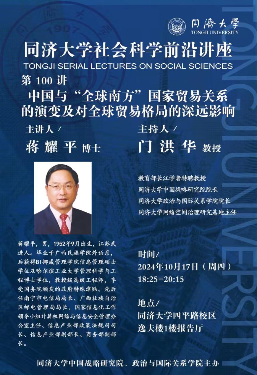 2024年10月17日,由同济大学中国战略研究院/半岛online(中国)主办的同济大学高等讲堂第13讲/同济大学社会科学前沿讲座第100讲在同济大学四平路校区逸夫楼1楼报告厅成功举办。本次讲座邀请商务部前副部长蒋耀平博士作题为“中国与‘全球南方’国家贸易关系的演变及对全球贸易格局的深远影响”的主题演讲。本次讲座由教育部长江学者特聘教授门洪华院长主持,同济大学300余名师生参加此次讲座。
