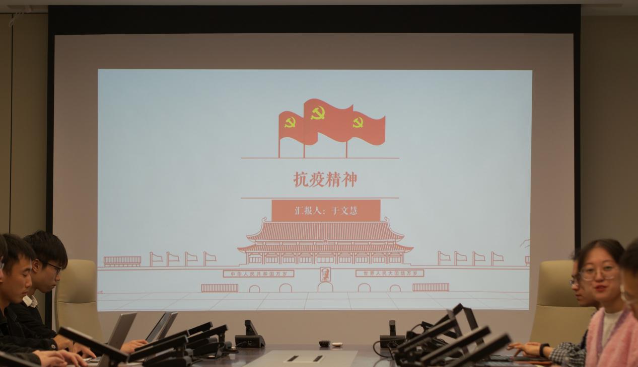 第三党小组的于文慧同志围绕“抗疫精神”进行了相关分享。她总结道说,抗疫精神有二十字的核心内容,生命至上,举国同心,舍生忘死,尊重科学,命运与共。抗疫精神形成于艰苦的抗疫实践当中,在党的坚强领导下,中国人民经历了艰苦卓绝的抗疫斗争,率先实现复工复产,这背后就是以伟大的抗疫精神作做支撑。作为大学生,我们要传承和弘扬抗疫精神,作为大学生,要充满信心,敢于胜利,迎难而上,砥砺奋进;要特别能吃苦,特别能战斗,特别能奉献;要忠于职责,展现担当作为。