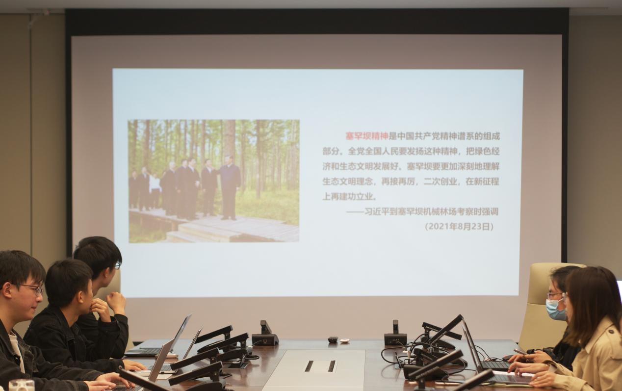 首先,第一党小组的徐泱泱同志围绕“塞罕坝精神”进行了心得分享。她认为,塞罕坝精神的内涵是牢记使命、艰苦创业、绿色发展,是在荒原变林海的历史过程和“敢教日月换新天”的三代塞罕坝人身上孕育形成的。其中,牢记使命是根本,塞罕坝人的神圣使命就是为首都阻沙源、为京津涵水源;艰苦创业是核心,塞罕坝人百折不挠、努力奋斗;绿色发展是鲜明特征,塞罕坝之路诠释了绿水青山就是金山银山的发展理念。王尚海、陈彦娴、刘军王娟夫妇等塞罕坝精神的践行者们坚守理想信念、坚持党的领导并保持精神韧性,走出了一条特色绿色发展之路和脱贫攻坚之路,对引导共建生态文明和美丽中国起到了先锋模范作用。
