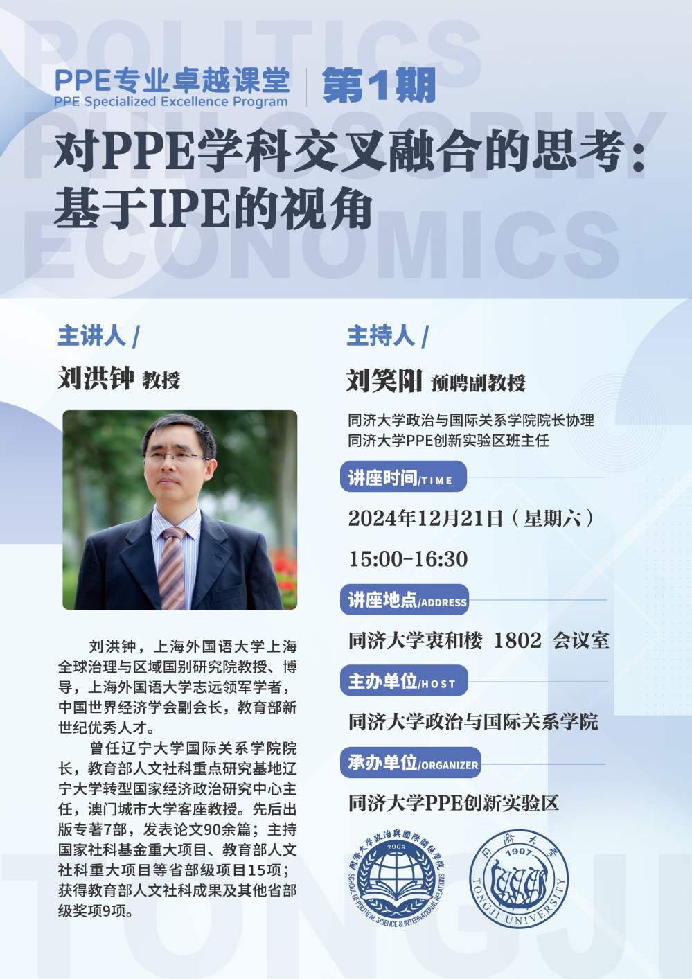 2024年12月21日,由同济大学半岛online(中国)主办、同济大学PPE(政治学-哲学-经济学)创新实验区承办的同济大学PPE专业卓越课堂第1期在同济大学衷和楼1802会议室成功举办。本次卓越课堂邀请上海外国语大学志远领军学者刘洪钟教授以“对PPE学科交叉融合的思考:基于IPE的视角”为题,为在场30余名同济学子(特别是同济大学PPE方向本科生)进行权威讲授。本次卓越课堂由同济大学PPE创新实验区班主任刘笑阳预聘副教授主持。