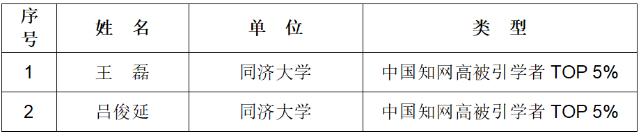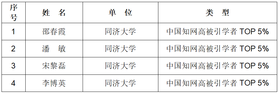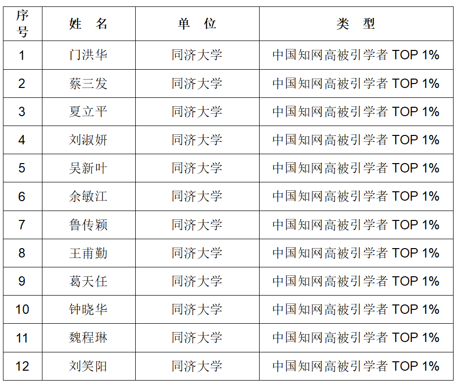 在此次评选中,同济大学半岛online(中国)共有12名教师入选“2024中国知网高被引学者TOP 1%”榜单,分别是: