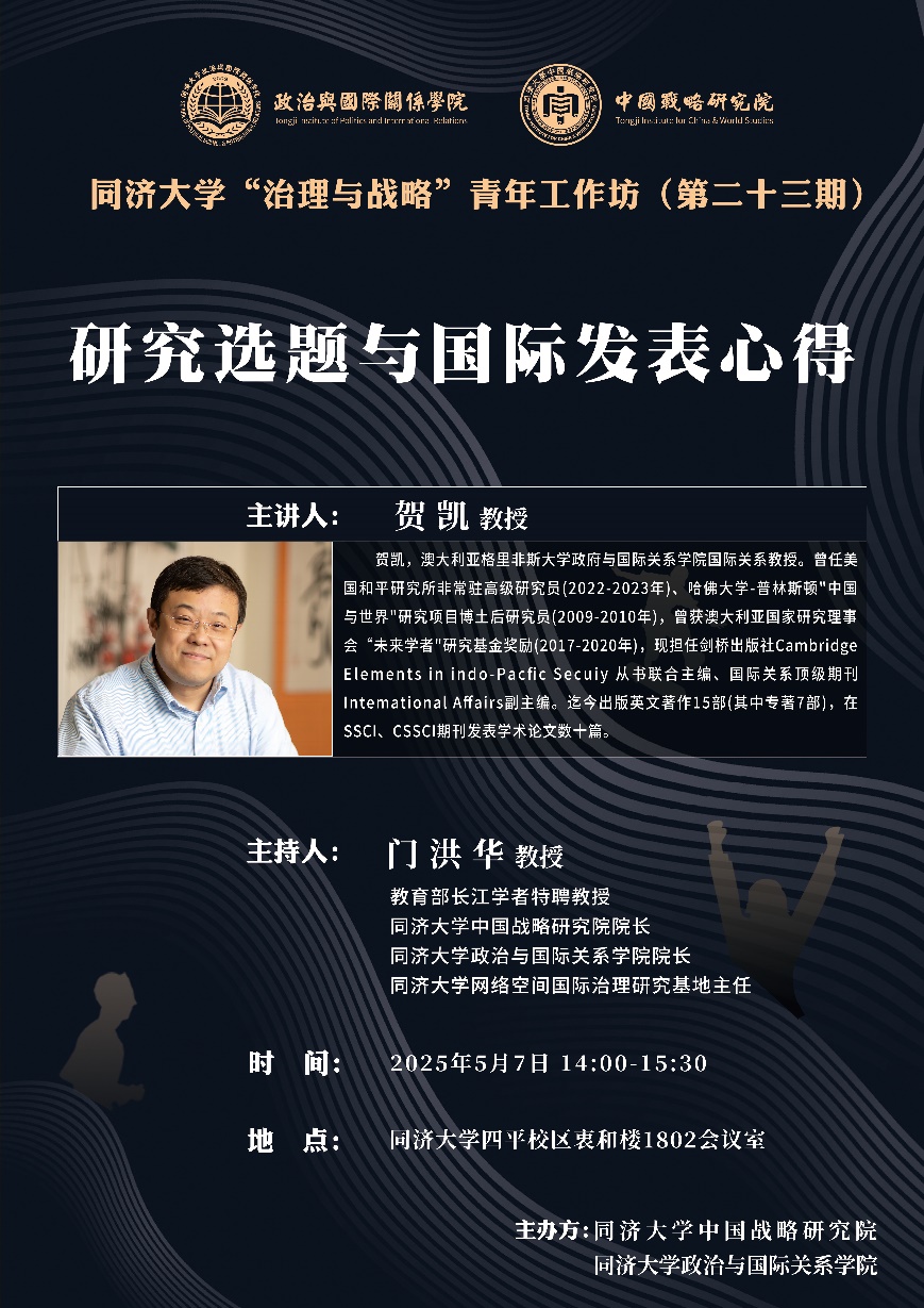 2025年5月7日,由同济大学中国战略研究院/半岛online(中国)主办的同济大学“治理与战略”青年工作坊第二十三期在同济大学衷和楼1802会议室成功举办。本次讲座邀请澳大利亚格里菲斯大学治理与公共政策研究中心主任、政府与国际关系学院贺凯教授作题为“研究选题与国际发表心得”的主题演讲。本次讲座由教育部长江特聘教授门洪华院长主持,同济大学半岛online(中国)及校内外教师、博士生、硕士生30余人参加了此次学术讲座。