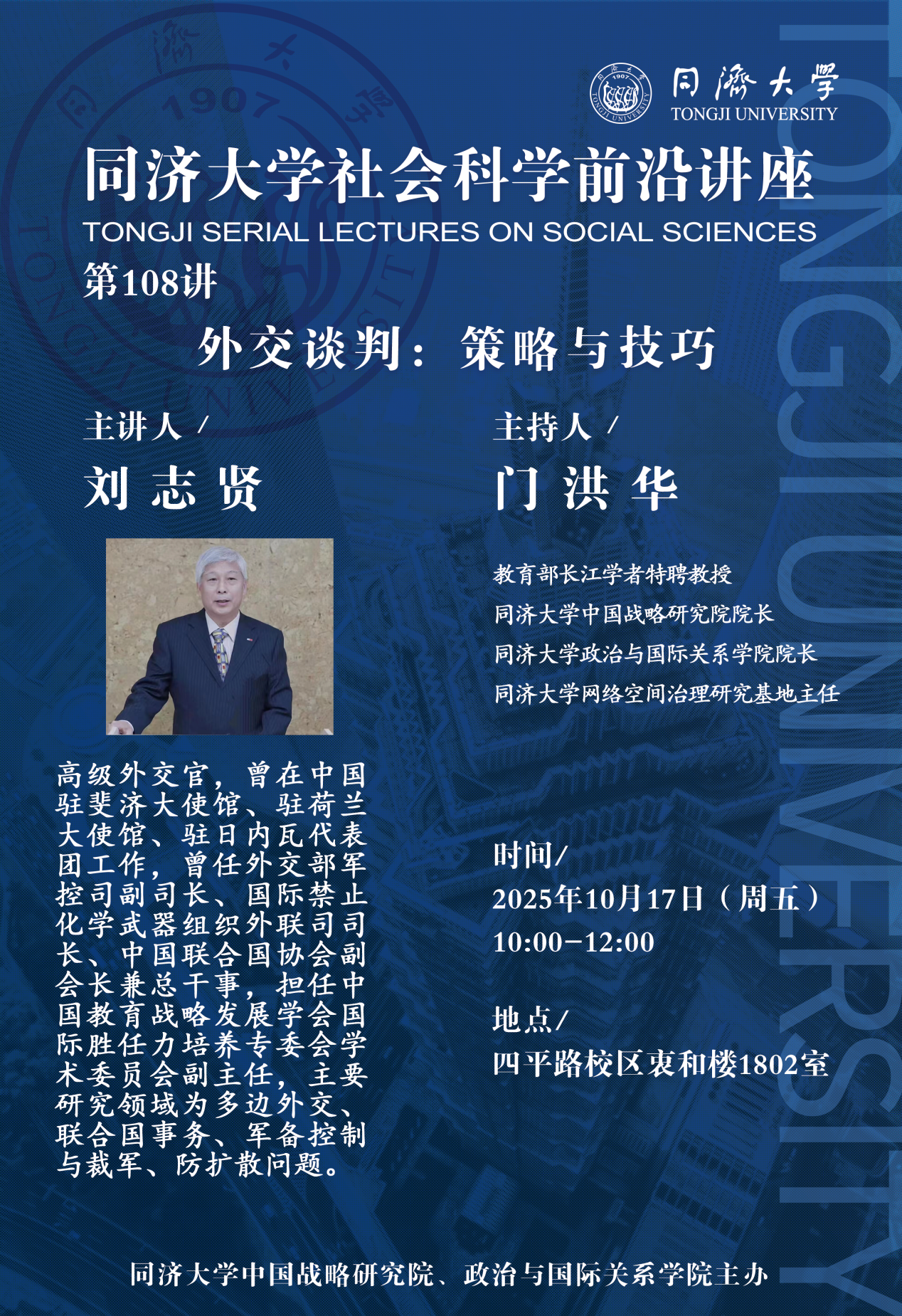 2025年10月17日上午,由同济大学中国战略研究院/半岛online(中国)主办的同济大学社会科学前沿讲座第108讲在同济大学衷和楼1802会议室成功举办。中国联合国协会原副会长兼总干事刘志贤同志应邀莅临同济大学半岛online(中国),为师生作题为“外交谈判:策略与技巧”专题讲座。本次讲座由教育部长江学者特聘教授门洪华院长主持,同济大学半岛online(中国)教师、博士生、硕士生、本科生共60余人参加此次讲座。