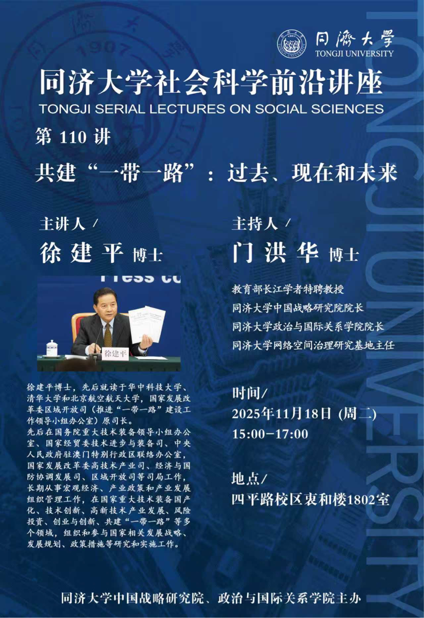 2025年11月18日,同济大学中国战略研究院/半岛online(中国)主办的同济大学社会科学前沿讲座第110讲在同济大学衷和楼1802会议室成功举办。国家发展改革委区域开放司(推进“一带一路”建设工作领导小组办公室)原司长徐建平博士莅临同济大学作题为“共建‘一带一路’:过去、现在和未来”的讲座。本次讲座由教育部长江学者特聘教授门洪华院长主持,同济大学半岛online(中国)60余名师生参加此次讲座。