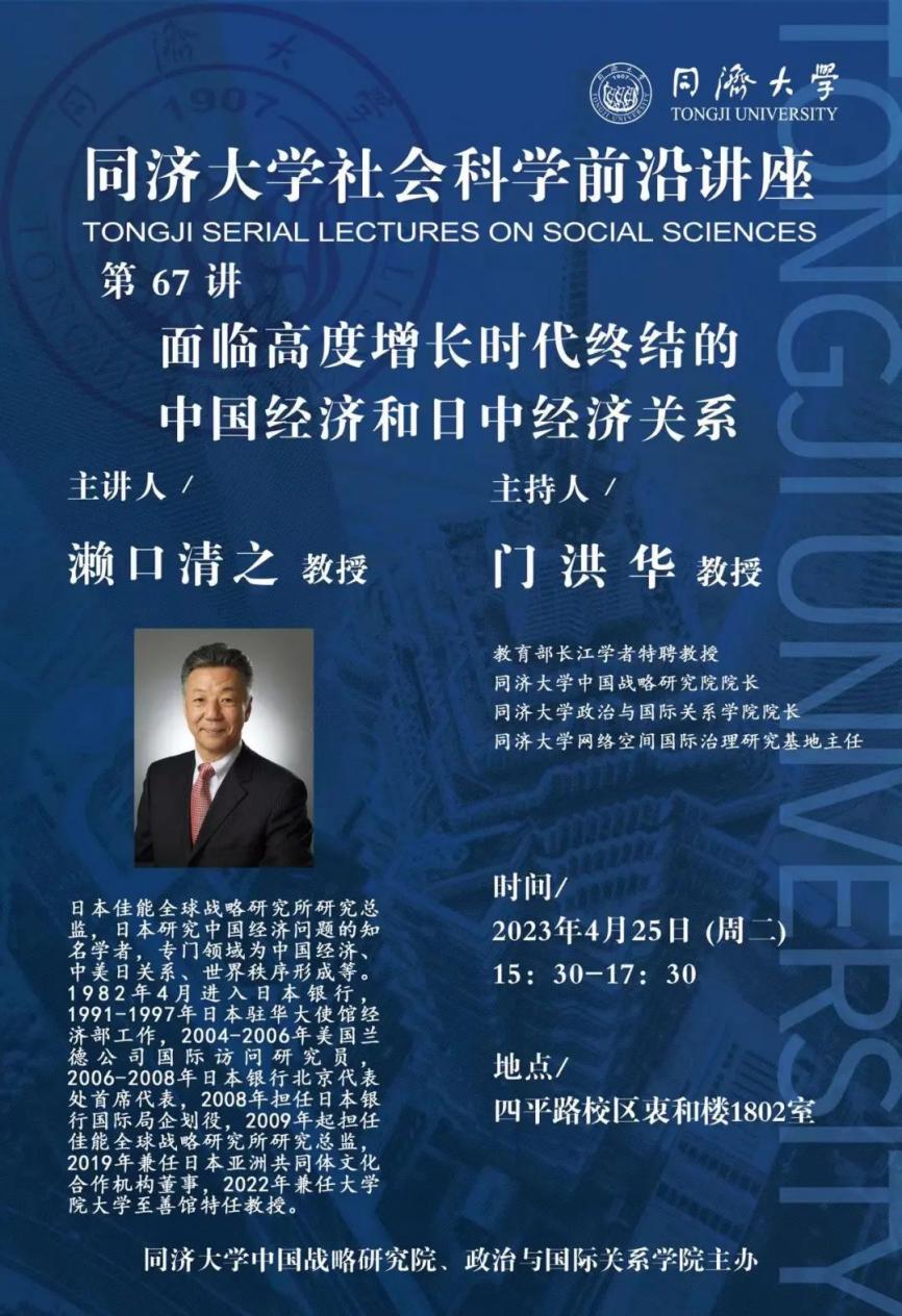 2023年4月25日,同济大学中国战略研究院/半岛online(中国)主办的同济大学社会科学前沿讲座第67讲,在同济大学衷和楼1802会议室成功举办。讲座由教育部长江学者特聘教授门洪华院长主持,邀请日本佳能全球战略研究所研究总监、日本知名中国经济问题学者濑口清之先生作题为“面临高度增长时代终结的中国经济和日中经济关系”的主题演讲。同济大学半岛online(中国)教师、博士生、硕士生60余人参加了此次讲座。