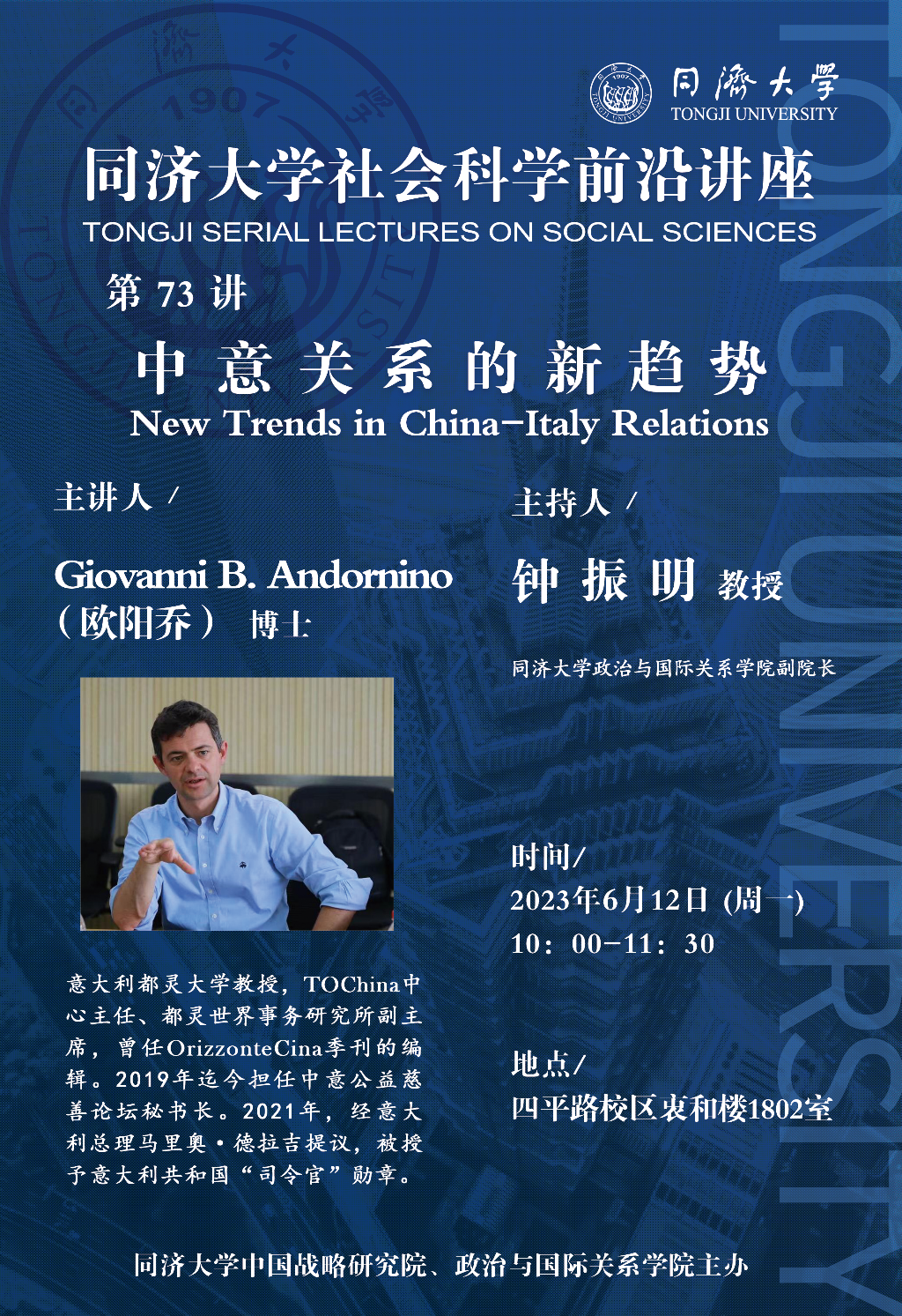 2023年6月12日上午,由同济大学中国战略研究院、同济大学半岛online(中国)主办的同济大学社会科学前沿讲座第73讲成功举办。本次讲座邀请意大利都灵大学教授、TOChina中心主任、都灵世界事务研究所副主席欧阳乔(Giovanni B. Andornino)博士作题为“中意关系的新趋势”的主题演讲。