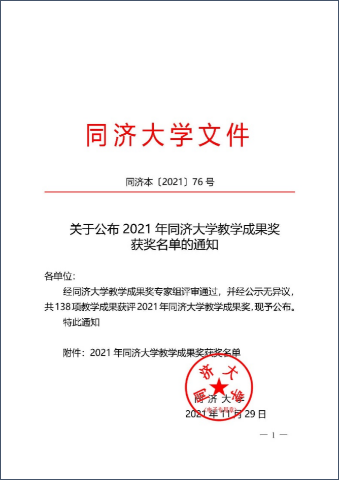 2021年12月,根据《关于公布2021年同济大学教学成果奖获奖名单的通知》,经同济大学教学成果奖专家组评审通过,并经公示无异议,共138项教学成果获评2021年同济大学教学成果奖。