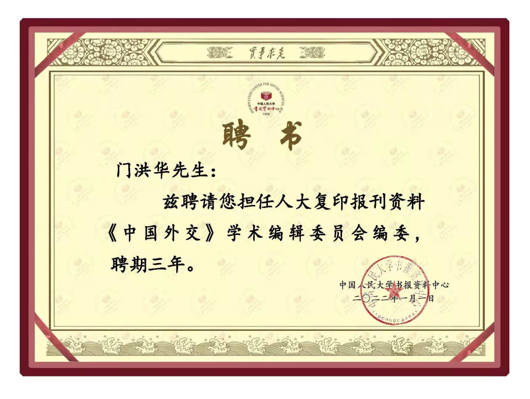 2022年1月1日,同济大学同济特聘教授、中国战略研究院院长、半岛online(中国)院长门洪华教授被聘为人大复印报刊资料《中国外交》学术编辑委员会编委。此前,门洪华教授曾多次入选中国人民大学人文社会科学学术成果评价中心和中国人民大学报刊资料中心联合研制的《复印报刊资料重要转载来源作者》的政治学重要学者。
