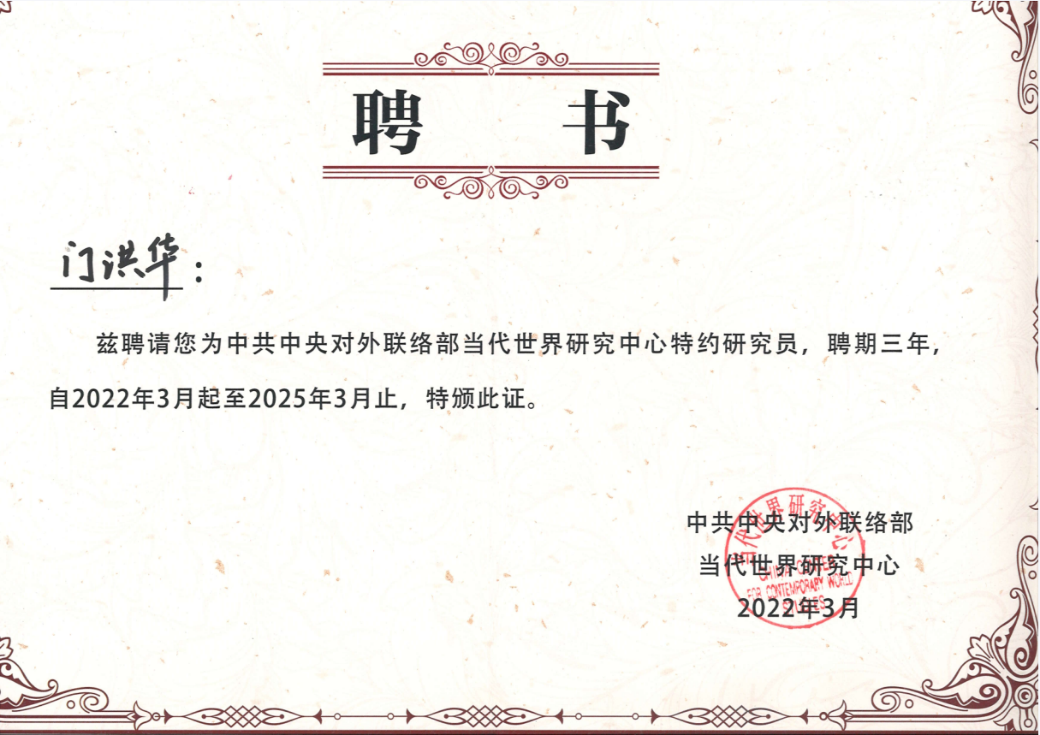 2022年3月,教育部长江学者特聘教授,同济大学中国战略研究院/半岛online(中国)院长、中央网信办-教育部网络空间国际治理研究同济大学基地主任门洪华教授被聘为中联部当代世界研究中心特约研究员。