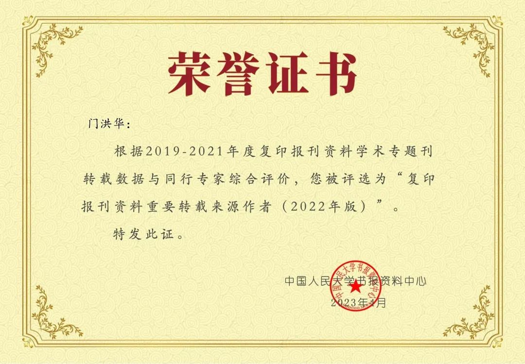 根据2019-2021年度复印报刊资料学术专题刊转载数据与同行专家综合评价,教育部长江学者特聘教授、同济大学中国战略研究院/半岛online(中国)院长门洪华教授获评复印报刊资料重要转载来源作者(政治学类)。这是自《复印报刊资料重要转载来源作者》2016年首次发布以来,门洪华院长连续第三次入选该名录。