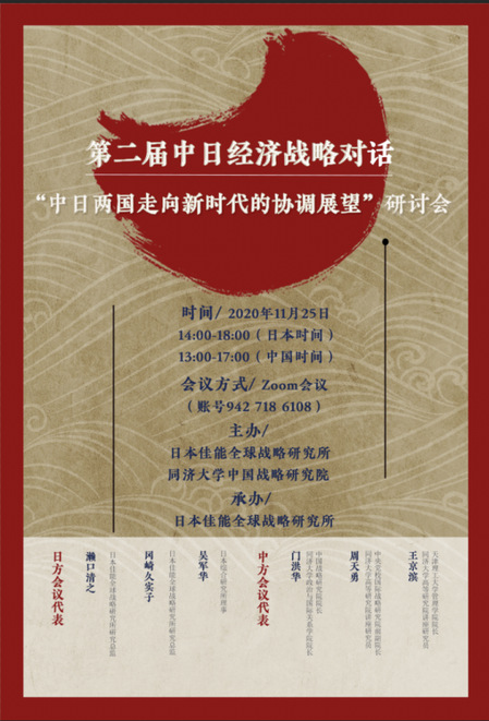 2020年11月25日,由日本佳能全球战略研究所和同济大学中国战略研究院共同主办、日本佳能全球战略研究所承办的“第二届中日经济战略对话——中日两国走向新时代的协调展望”在线上举行,来自中日两国的六位专家学者围绕中日关系以及中日经济合作展开了研讨和交流。日本佳能全球战略研究所研究总监濑口清之先生主持此次研讨会。