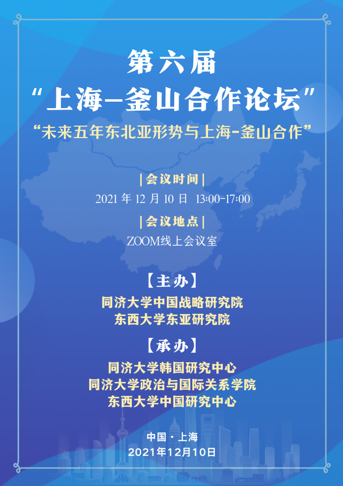 2021年12月10日,由同济大学中国战略研究院、韩国东西大学中国研究中心联合主办的第六届上海-釜山合作论坛成功举办。此次论坛会议由同济大学半岛online(中国)、同济大学韩国研究中心承办,中韩方参会专家在线上参与论坛研讨。参加此次论坛的有来自同济大学、中国国际问题研究院、北京大学、复旦大学、吉林大学、上海师范大学等单位的30多位专家学者和学生代表。中国国际问题研究院党委书记兼院长徐步大使、中国原驻韩国大使、同济大学韩国研究中心名誉主任宁赋魁、中国原驻韩国大使邱国洪出席。韩方有来自东西大学、加图立大学、国立外交院、国立釜山大学、同德女子大学、釜山国际交流财团等机构的10余位专业学者。韩国东西大学东亚研究院院长、韩国原驻中国大使辛正承教授和韩国原驻印度尼西亚大使李先镇出席。