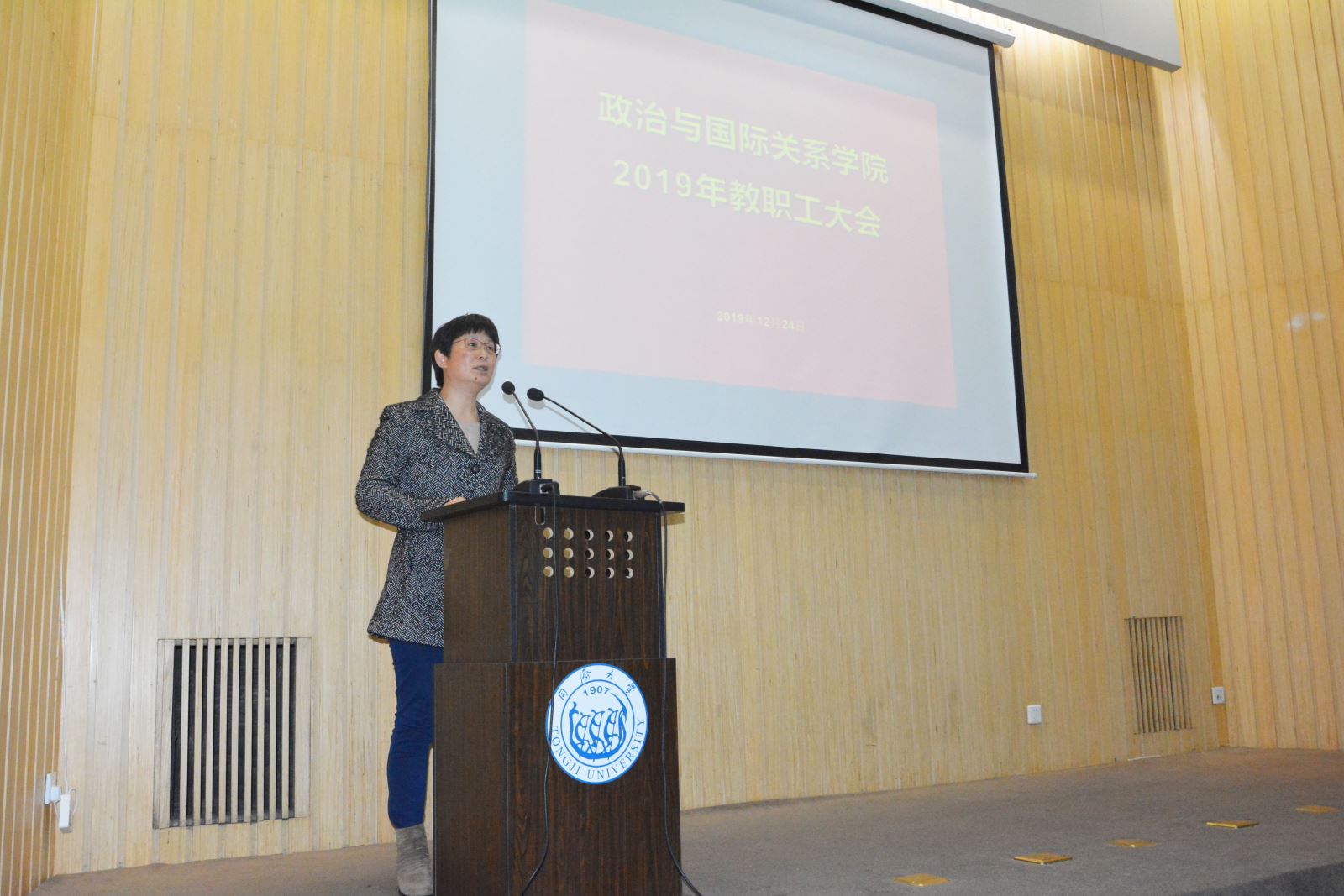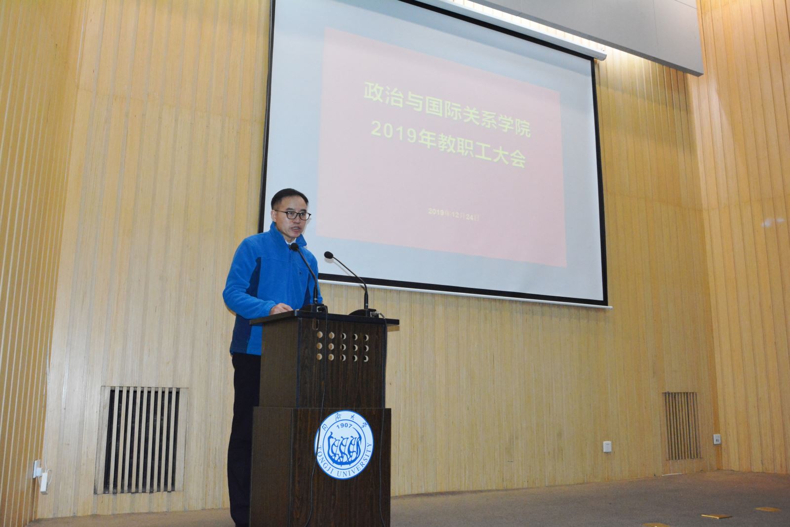 门洪华院长围绕七个方面的工作进展情况作了工作报告。一是立足新时代,对接学校改革方向,持续提升人才培养质量。学院狠抓教学工作,落实各项教学管理规定,积极对接学校本科教学管理大类改革,制定新的培养方案,组织精干教学团队参与学校形势与政策课程教学工作。学生毕业论文质量持续提升,一批名师、优课不断推出,招生工作稳步推进。研究生的招生、管理、教学、培养全面提升水平。《国际政治学》《国际政治经济学》等由学院教授担纲首席专家的马工程重点教材陆续出版。二是坚持立德树人,传承优秀文化,深化内涵建设,提升育人水平。学院落实“三全育人”工作要求,进一步完善协同育人工作机制。学院以育人为导向,强化实践育人、文化育人、服务育人。学院持续提升学生创新实践能力,学生在一系列全国和区域性的创新实践竞赛活动中取得佳绩。学院持续组织开展系列读书活动和重走红色调研之路实践活动,举办学生主题论坛,激发青年爱国热情。三是厚植基础,彰显特色,学科建设整体水平快速提升。学科建设持续取得突破性进展,政治学学科第一批博士生如期入学,政治学一级学科博士后科研流动站获批,学院发展基础进一步夯实。学院负责组织同济大学社会科学学科群一流学科建设工作,组织出版“同济大学社会科学丛书”,主导承担的一流学科“欧洲研究”建设中期评估顺利完成。积极参与教育部高等学校政治学类专业教学指导委员会工作会议,对接国家学科建设和专业发展需求,谋划学科建设布局。四是强化科研规划,巩固重点方向,提升科研水平,拓展合作空间。新增包括教育部哲学社会科学重大攻关项目在内的30余项省部级及以上课题,科研成果愈加丰富。开展丰富多彩的学术活动,主办或联合主办第三届中国战略论坛、第一届“一带一路”发展论坛、第一届中日经济战略对话、第四届上海-釜山合作论坛、中韩关系与东北亚合作国际研讨会、第二届全球青年学者峰会等系列高端学术会议,学院的国际影响力和美誉度进一步提升。五是对接国家战略需求,服务国家决策咨询,智库建设取得新突破。以战略研究为主题和特色,对接国家发展需求,与外交部、中联部、商务部等国家部委联系合作,承接委托课题,为国家发展建言献策,多篇报告得到领导人批示。加强智库合作,开展共同调研,联合发布智库成果。持续推进“一带一路”智库课题专项研究,三年来共立项课题40余项。六是深化对外交流,推动国际合作,提升国际学术影响力。招收国际学生24名,国际国内学生数量的比例名列全校专业学院第二位。组织10多名学生参加“佛罗伦萨暑期班”研学活动,合作举办研究生国际论坛,选派本科生和研究生赴海外留学。深化与意大利、韩国、芬兰、西班牙、法国、日本等国家的知名高校合作项目,与意大利都灵大学联合启动双硕士学位项目。七是学院进一步强化制度建设,以制度建设为抓手提升学院治理能力和水平。学院制度建设迈上新台阶,进一步加强制度执行力度,推进学院治理走在健康有序的道路上。学院全面开展“不忘初心、牢记使命”主题教育,建立院领导与师生深入交流的座谈沟通机制,把作风建设作为一项基础工作常抓不懈,“制度立院”落到细节深处。
