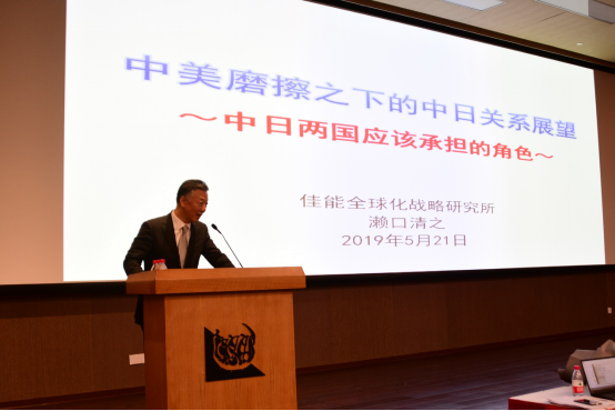 随后,濑口清之先生以“中美摩擦之下的中日关系展望”为题进行演讲。濑口先生指出,对于美国而言,中国经济实力和军事实力两方面都对美国构成了威胁,由于中国的市场开放性和市场魅力比较大,中美关系恶化将使美国面临失去中国市场的打击,这将限制美国的打击力度。因此他认为,中国政府应优先国内改革与进行对美协调,主张中国应该选择加入TPP。濑口先生预测,目前中国经济将持续稳定发展到本世纪20年代,中国应当利用好这一机会推动改革;中国政府今年的政策课题主要是克服中美贸易摩擦带来的不确定性因素,推进改革和保持稳定的宏观经济。在谈到中日经济关系时,他主要强调民间交流对两国关系积极的促进作用和中国对日本企业的重要性,认为中日关系将继续保持着友好改善的方向。