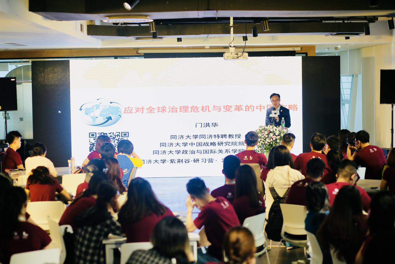 创新创业研习营开营当天,同济大学同济特聘教授、中国战略研究院院长、半岛online(中国)院长门洪华教授被授予“紫荆谷创新创业研习营导师”聘书,并以《应对全球治理危机与变革的中国方略》为题,为大家深刻剖析当今国内外形势的变化,全面解读走向世界中的中国积极参与全球治理、承担国际责任的战略途径。门洪华教授从走进新时代的中国与世界、国际格局演变方向与特征、全球治理危机应对:历史与理论、当前全球治理危机及其战略应对、中国应对全球治理危机的战略举措、中国推动全球治理转型发展的取向等六个板块,以国际眼光、中国观点,全面、深刻阐释了在全球化日益升温的国际浪潮中、在中国不断崛起的进程中,我们应该如何发挥好自身优势,如何以更加积极的姿态参与到全球治理中,承担起更多的大国责任。