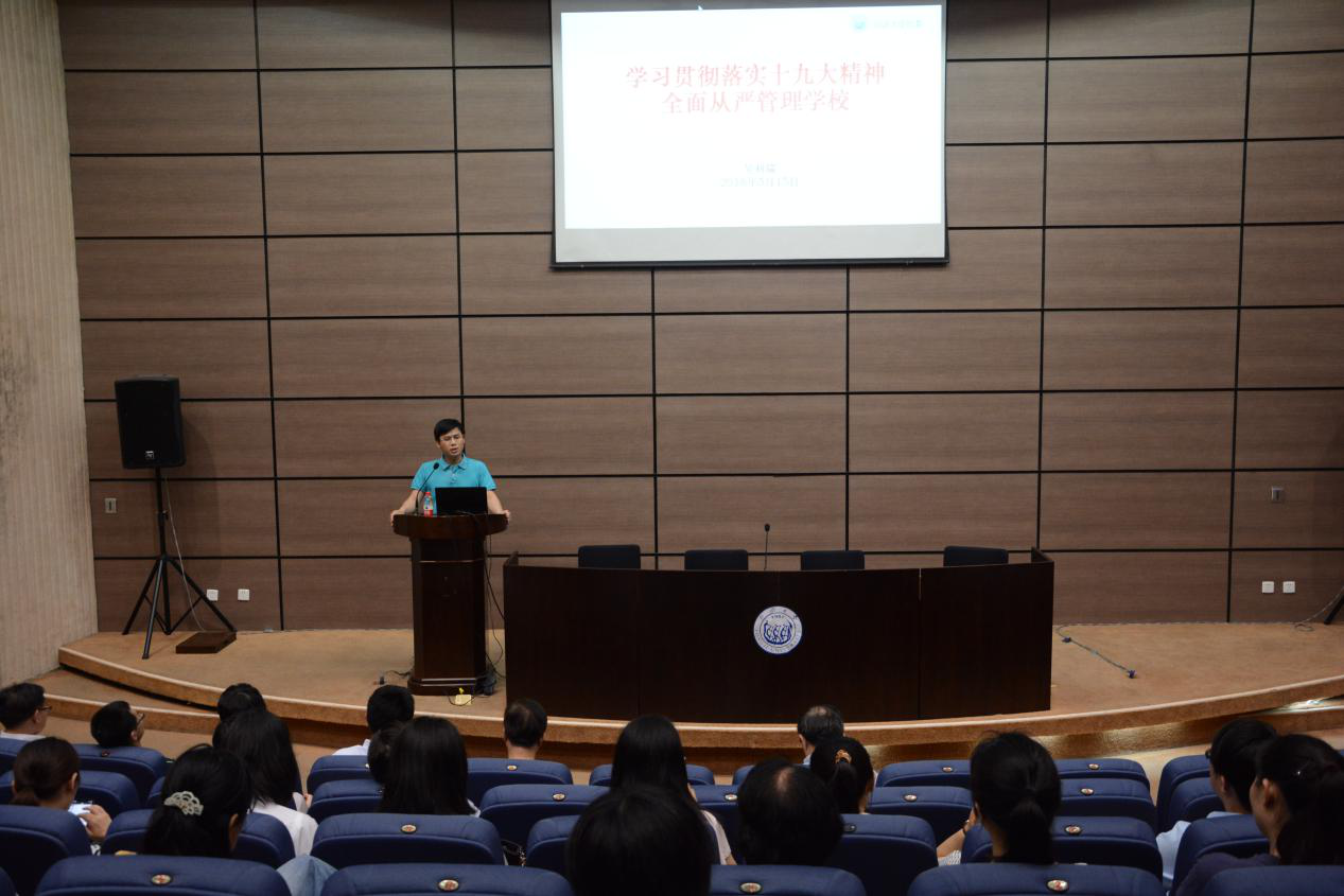 吴利瑞副书记首先以党的十九大报告内容为切入点,他详细梳理了“关于党的十九大主题和主要成果、关于习近平新时代中国特色社会主义思想、关于过去五年的历史性成就和历史改革、关于中国特色社会主义进入新时代、关于我国社会主要矛盾的变化、关于两个一百年奋斗目标的战略部署、关于我国经济社会发展重大战略部署、关于坚定不移推进全面从严治党”八个方面,深刻阐述了十九大精神的重要内容,强调每位教师、每位党员都应该做到“不忘初心、牢记使命”,坚决抵制腐败,从我做起,把反腐败斗争进行到底。