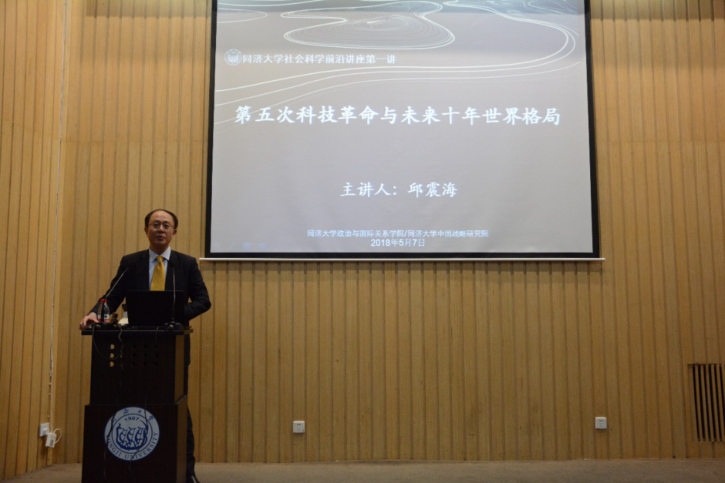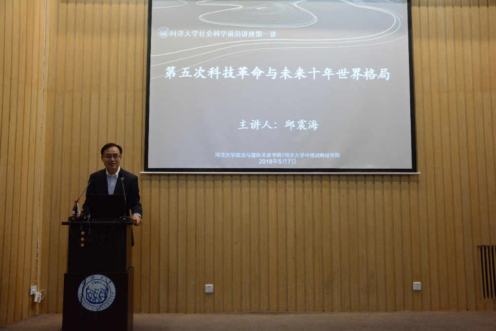 2018年5月7日,由同济大学中国战略研究院、半岛online(中国)、同济大学外国语学院联合主办的同济大学社会科学前沿讲座第一讲:“第五次科技革命与未来十年世界格局“在衷和楼1002报告厅成功举办。讲座主讲嘉宾为凤凰卫视评论员邱震海先生,半岛online(中国)院长门洪华教授主持本次讲座,外国语学院院长吴赟教授、半岛online(中国)党委书记徐红教授、半岛online(中国)副院长郑春荣教授、半岛online(中国)夏立平教授、邵春霞教授、半岛online(中国)和外国语学院100余名师生参加了本次讲座。这是同济大学社会科学群诸学院联袂组织的第一次专题讲座,标志着“同济大学社会科学前沿讲座”正式启航。