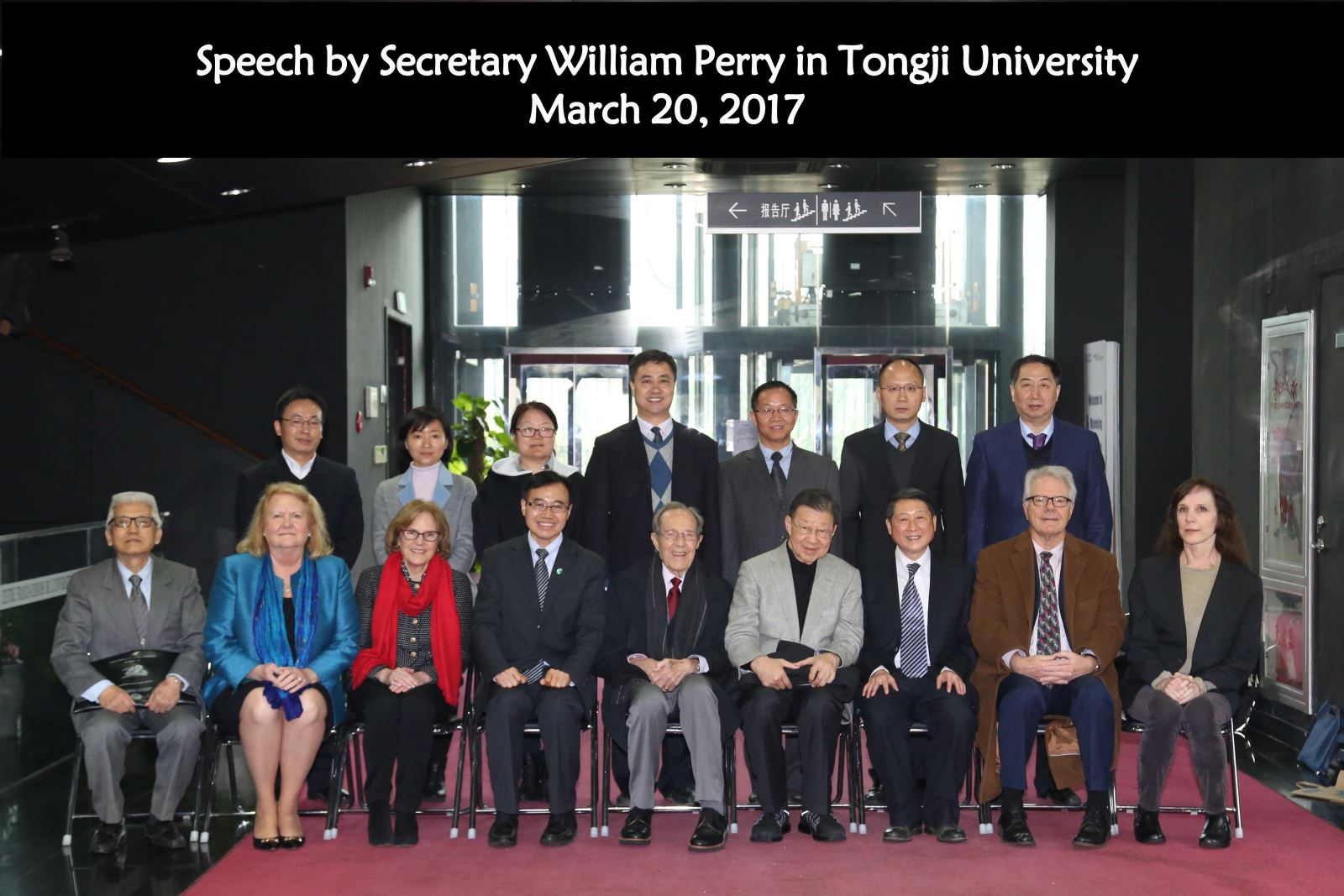 2017年3月20日,由同济大学半岛online(中国)、中国战略研究院共同主办的同济大学“中国与世界”名家系列讲座第八讲在同济大学中法中心成功举办。美国前国防部长、斯坦福大学胡佛研究所暨国际安全与合作中心高级研究员威廉·佩里教授(William J. Perry)与美中关系全国委员会前主席、约翰·霍普金斯大学保罗·尼采高级国际问题研究院中国系主任大卫·兰普顿(David Lampton)教授一行10人应邀访问同济大学。威廉·佩里教授在中法中心C401会议厅,发表了主题演讲。随后,大卫·兰普顿教授就中美关系的现状以及双边关系发展中的重要议题作了精彩发言。出席活动的嘉宾还有佩里的秘书黛波拉·戈登(Deborah Gordon)、佩里的两位女儿罗宾·佩里(Robin Perry)和瑞贝卡·佩里(Rebecca Perry)、威廉·佩里教授著作的译者等。同济大学半岛online(中国)院长兼中国战略研究院院长门洪华教授、半岛online(中国)院长副院长王存刚教授和郑春荣教授、半岛online(中国)夏立平教授、仇华飞教授、王传兴教授、潘敏教授、钟振明副教授等60余位师生参加了讲座。本次主题演讲由同济大学半岛online(中国)夏立平教授主持。