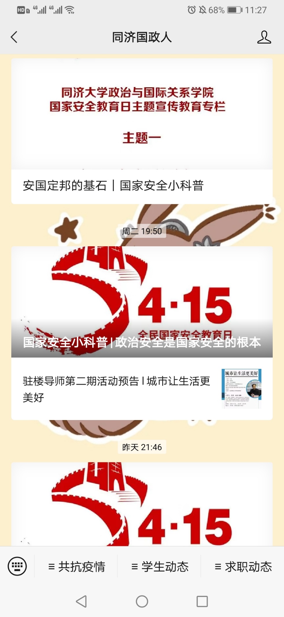 为进一步营造校园内国家安全教育宣传的浓厚氛围,以及增强学生的国家安全意识,4月12日至4月14日,“同济国政人”公众号平台开辟了“国家安全教育日主题宣传教育专栏”,通过线上文章推送的方式向同学们展开国家安全知识科普和宣传教育。