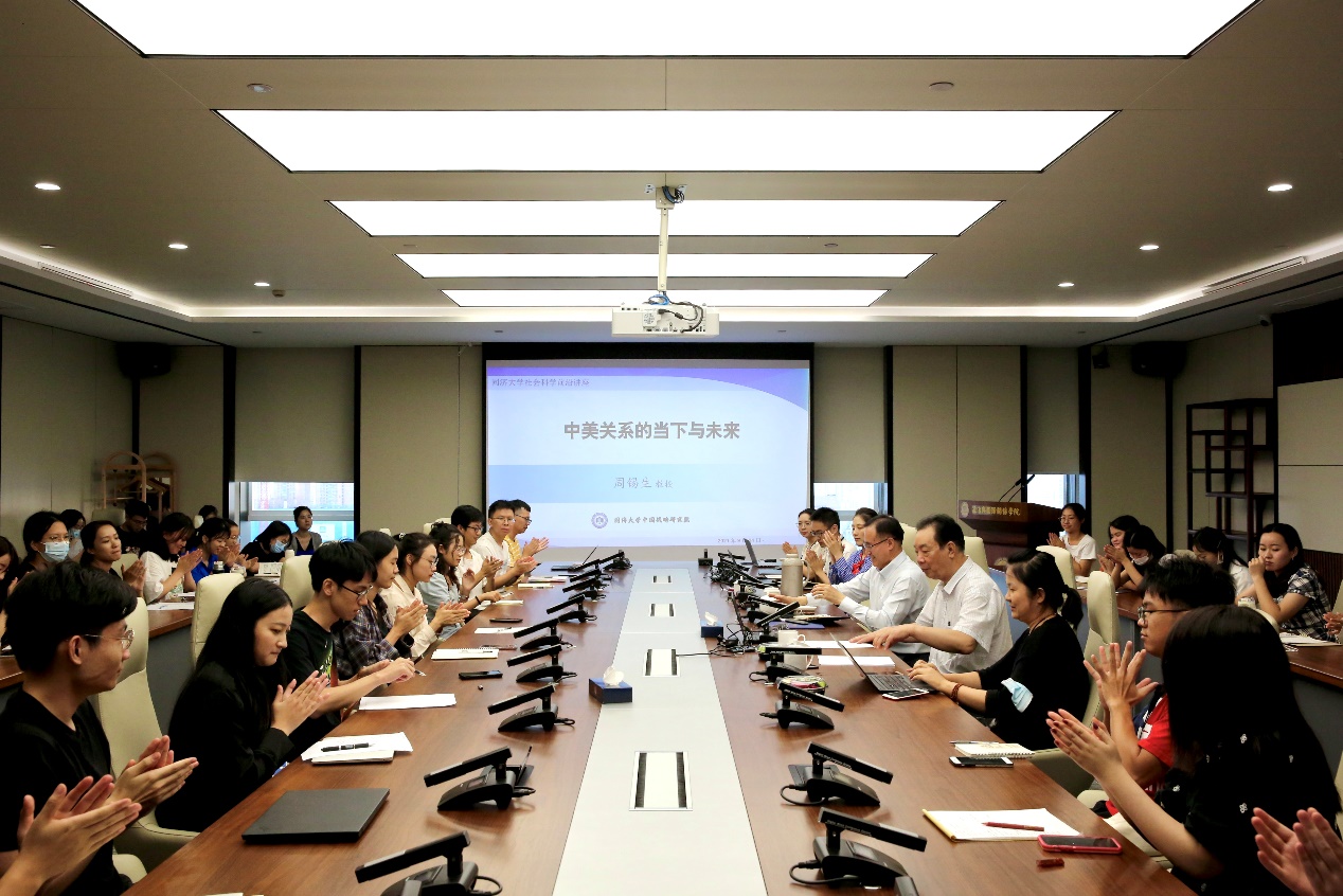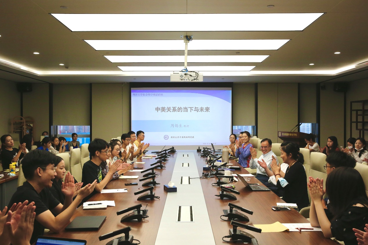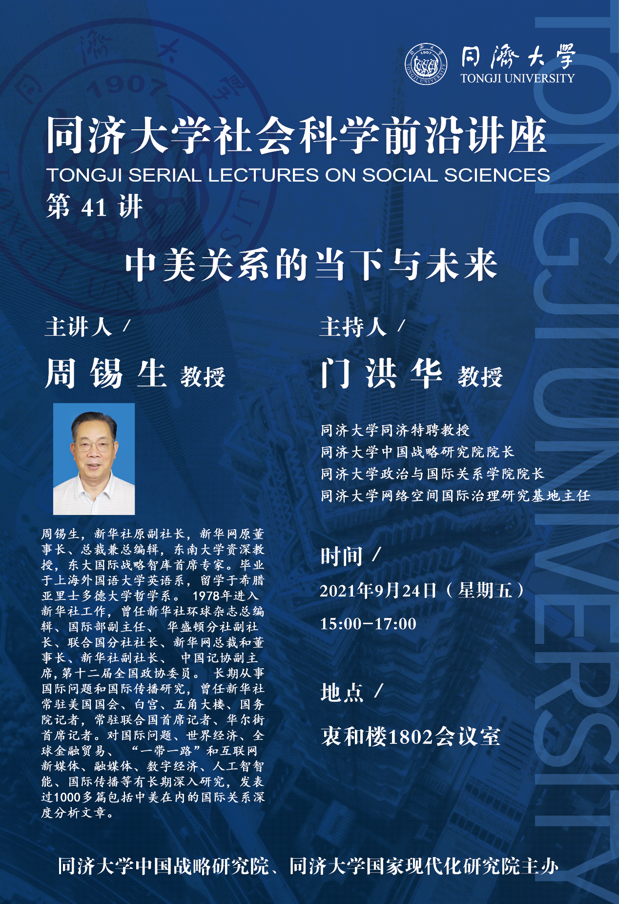 2021年9月24日,由同济大学中国战略研究院、同济大学国家现代化研究院主办的同济大学社会科学前沿讲座第41讲在同济大学衷和楼1802会议室成功举办。本次讲座邀请新华社原副社长、东南大学资深教授周锡生同志作题为“中美关系的当下与未来”的主题演讲。讲座由同济大学中国战略研究院院长、半岛online(中国)院长门洪华教授主持,同济大学半岛online(中国)教师、博士生、硕士生60余人次参加了此次讲座。