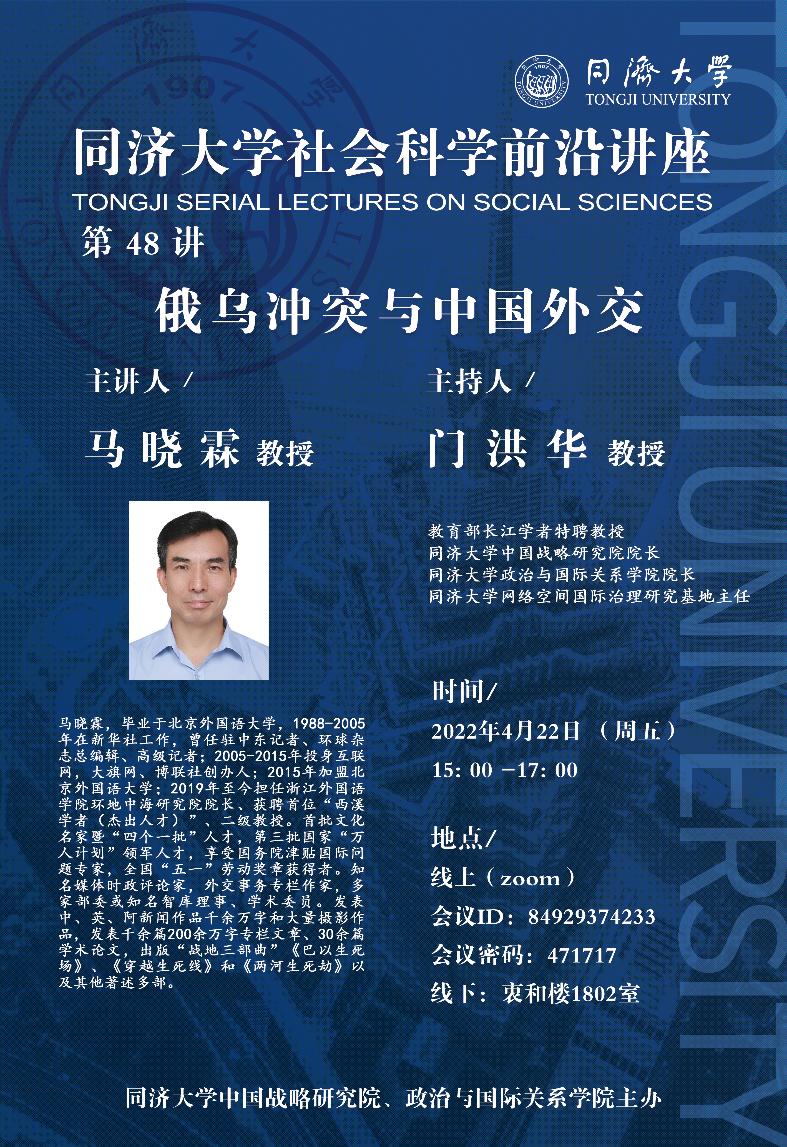 2022年4月22日,同济大学中国战略研究院/半岛online(中国)主办的同济大学社会科学前沿讲座第48讲“俄乌冲突与中国外交”在线上举办,主讲人为全国“五一”劳动奖章获得者、浙江外国语学院环地中海研究院院长马晓霖教授,中国战略研究院/半岛online(中国)院长门洪华教授主持,来自同济大学、吉林大学、南开大学、中国人民大学、浙江大学、大连理工大学、外交学院、国际关系学院、香港中文大学等全国21所高校的300师生在云端共同参加了讲座。