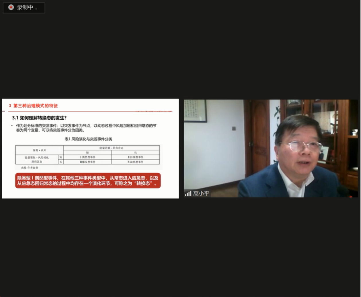 在互动环节,高小平研究员在线上回答了同济师生们的提问,就“转换态的边界认知”“如何构建与优化我国的应急管理体制”“如何完善基层政府间对口支援的体系建设”等问题进行了精彩的解答。