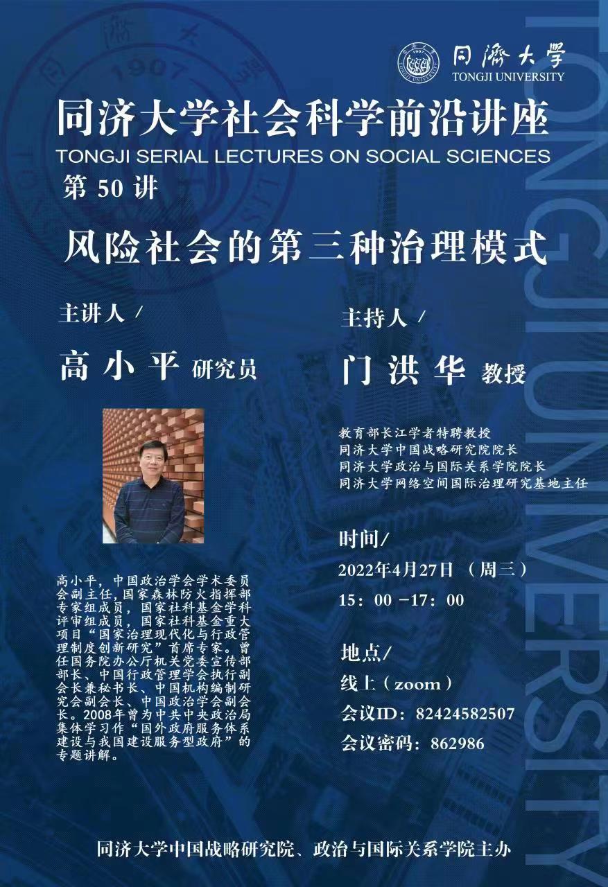 2022年4月27日,由同济大学中国战略研究院/半岛online(中国)主办的同济大学社会科学前沿讲座第50讲在线上成功举办。本次讲座邀请中国政治学会学术委员会副主任、中国行政管理学会前执行副会长兼秘书长、国家森林防火指挥部专家组成员、国家社科基金学科评审组成员高小平研究员作题为“风险社会的第三种治理模式”的主题演讲。本次讲座由门洪华院长主持,同济大学半岛online(中国)共110余名师生参加了此次线上学术讲座。