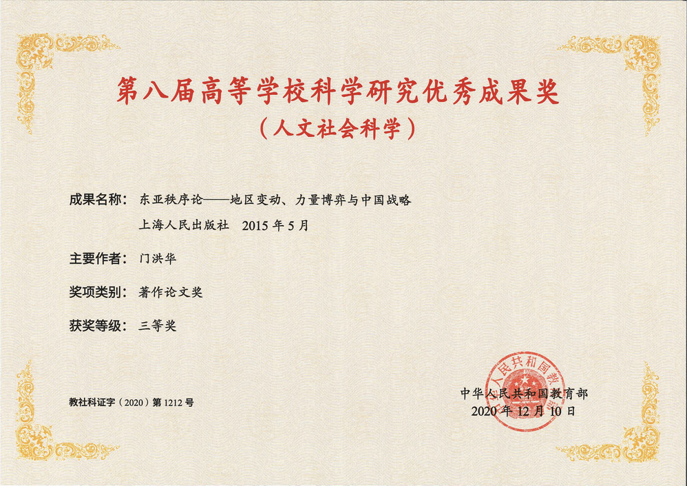 门洪华院长专著《东亚秩序论》荣获第八届高等学校科学研究优秀成果奖