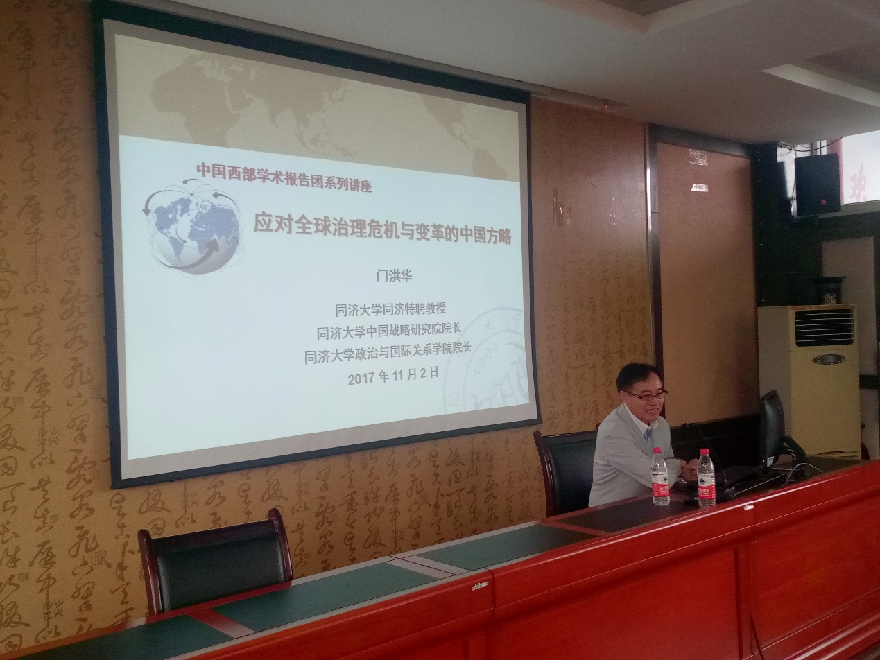 The fifth public academic activity “Western China Academic Report Group – Chongqing Trip”, organized by the Institute for China & World Studies of Tongji University, undertaken by the Party School of the CPC Chongqing Municipal Committee, and funded by HNA Group, was grandly held in the mountain city of Chongqing on November 1-2, 2017. Tongji Distinguished Professor Men Honghua, Dean of the School of Political Science & International Relations and President of the Institute for China & World Studies, Tongji University, participated in all relevant activities.