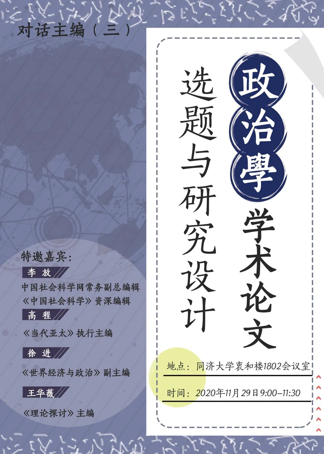 Hosted by the Institute for China & World Studies and the School of Political Science & International Relations (SPSIR) of Tongji University, the 3rd academic seminar 'Dialogue with Editor-in-Chief' was successfully held in Conference Room 1802, Zhonghe Building, Tongji University on November 29, 2020. Li Fang, Executive Deputy Editor-in-Chief of Chinese Social Sciences Net (CSSN) and Senior Editor of Social Sciences in China, researcher Gao Cheng, Executive Editor of Contemporary Asia-Pacific Studies, researcher Xu Jin, Deputy Editor-in-Chief of World Economy and Politics, and Wang Huawei, Editor-in-Chief of Theoretical Investigation, were invited to explore the theme of 'Topic Selection and Research Design for Academic Papers in Political Science'. Based on the style of their respective journals, the guests offered a lot of opinions and suggestions on topic selection and academic writing.